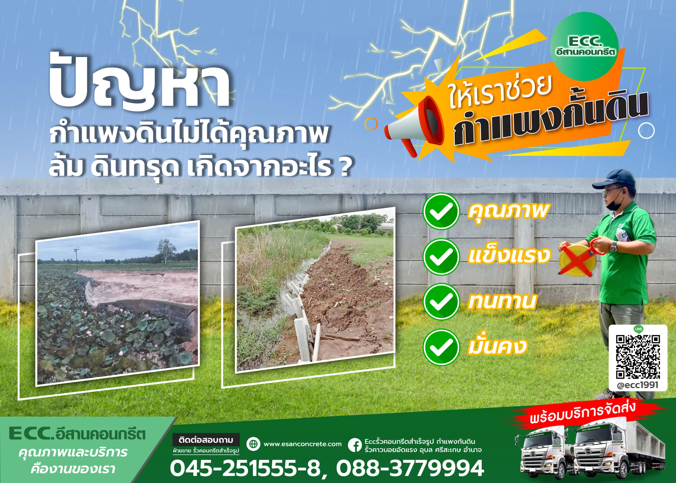 ซึ่งปัญหาเหล่านี้จะไม่เกิดขึ้น เพียงเลือก ผู้รับเหมาที่ได้คุณภาพ เชื่อถือได้ บริษัท อีสานคอนกรีต(1991) จำกัดรั้วสำเร็จรูปและกำแพงกันดินที่ได้คุณภาพ อีสานคอนกรีต มั่นใจในคุณภาพ สินค้าได้มาตรฐาน มอก. พร้อมผู้เชี่ยวชาญสำรวจพื้นที่ มืออาชีพในการติดตั้งออกแบบโครงสร้างกำแพงกันดินให้เหมาะสมกับหน้างาน เพื่อความแข็งแรง และคงทน